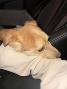 Schutzbedürftig stieg er mit ins Auto und kuschelte sich in Ruxandras Armen ein.