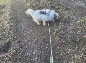 Bibo öffnet sich seinem Pflegefrauen gegenüber. Andere Personen knurrt er noch an. Bibo geht gut an der Leine und freut sich, draußen zu sein.