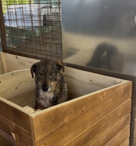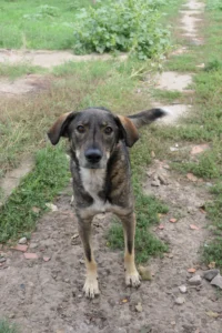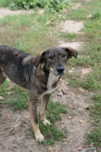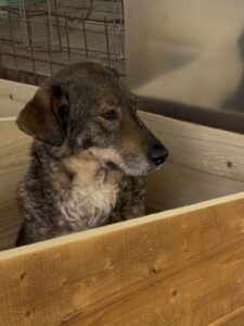 Dort waren die Hunde sich selbst überlassen. Kontakt zu Menschen gab es nicht. Wir vermuten, das Destino auf diesem furchtbaren Hof schon geboren wurde und bis zu seiner Aufnahme unter schlimmen Verhältnissen überleben musste.