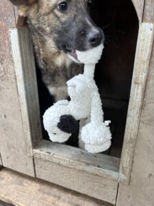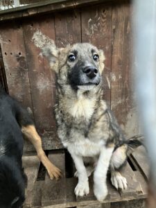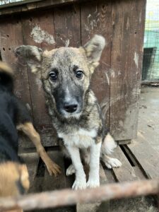 Hier im Shelter teilt er sich einen Zwinger mit seinen gleichaltrigen Freunden Fanny und Frodo. Die drei Welpen verstehen sich gut, spielen miteinander und kuscheln sich zusammen.