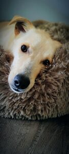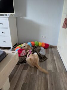 Flora mag Autofahren und kann sogar schon ein paar Stunden allein bleiben. Dann genießt sie die Ruhe und Geborgenheit ihres Körbchens und verarbeitet im Schlaf alle neuen Eindrücke.