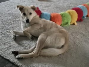 Flora ist noch etwas unsicher, dann sucht sie schnell Schutz bei ihrem Pflegefrauchen. Schnell ist dann auch klar, das sie keine Angst haben muss und alles neu erlebte schnell positiv abspeichert.