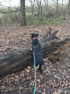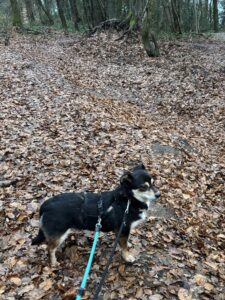 An der Leine laufen ist kein Thema. Ich weiß nicht, warum die Alle darüber immer diskutieren. Im Wald laufe ich schon allein, allerdings mit diesem langen Strick noch, den ich hinter mir her ziehen muss.