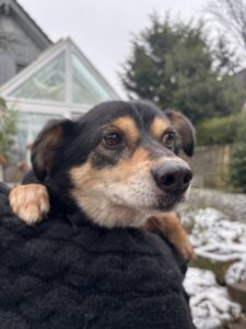 His physical wounds have healed. At the shelter, he is open to his fellow dogs and is starting to trust them. He is also developing trust in the people he knows and is happy, but still reserved, to be spoken to and given attention.