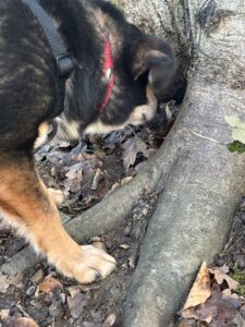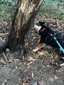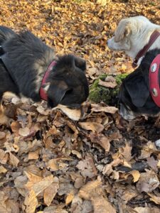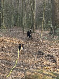 An der Leine laufen ist kein Thema. Ich weiß nicht, warum die Alle darüber immer diskutieren. Im Wald laufe ich schon allein, allerdings mit diesem langen Strick noch, den ich hinter mir her ziehen muss.