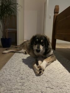Wir vermuten, das in ihm ein Herdenschutzanteil steckt. HSH-Mixe können dazu neigen, ihr Territorium mehr zu beschützen, als gewollt ist.