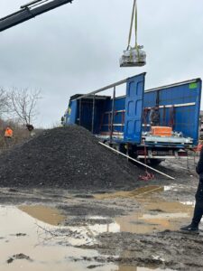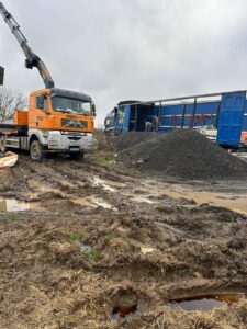 Trotz des anhaltend schlechten Wetters, trotz aufgeweichtem Gelände und der Belastung von Mensch und Maschine, ist das Material nun da!
