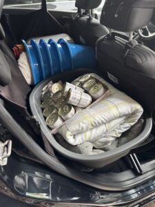 In Rainers Gepäck sind neue Liegen, Plastikbetten und Wassereimer für die gerade in Schutz genommenen Hunde aus dem öffentlichen Shelter.